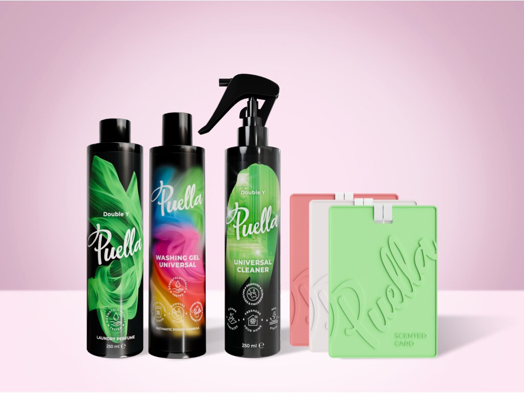 Enthält: Puella Wäscheparfüm 250 ml, Puella Waschgel 250 ml, Puella Universalreiniger 250 ml, Puella Duftkarten (1x Double Y, 1x Frayo, 1x Queenka)